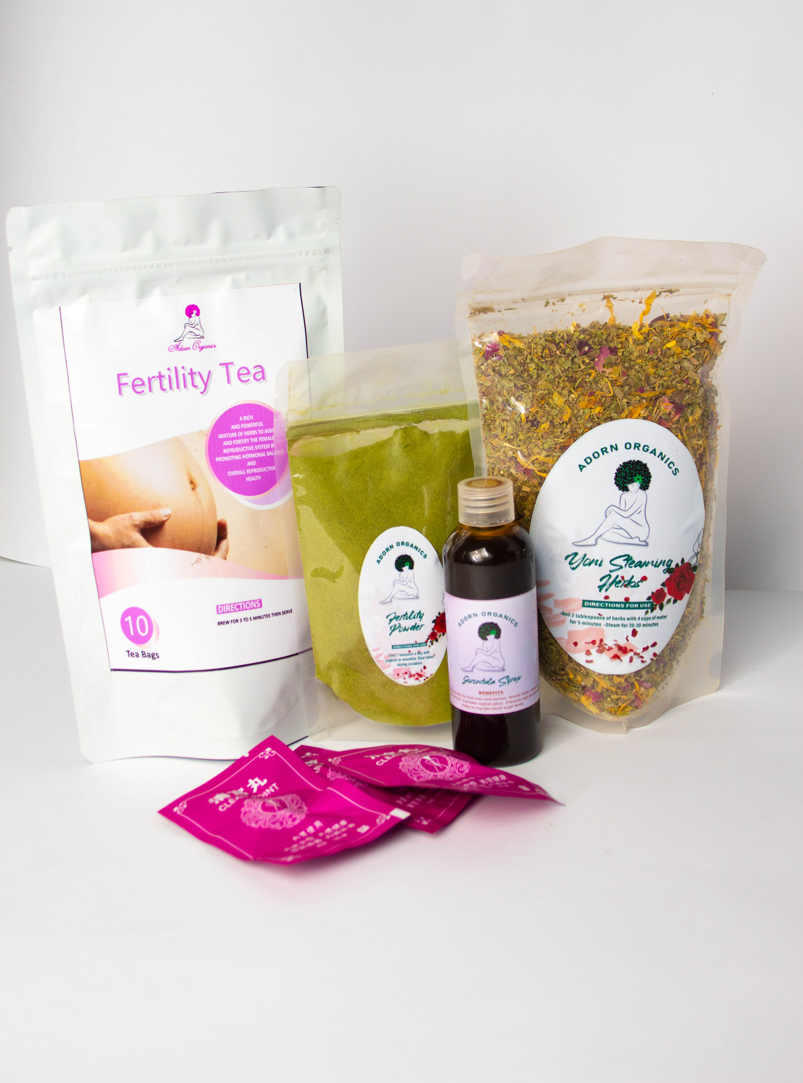 • Includes: 100g Yoni Steaming Herbs, 10 Fertility Teabags, 100ml Gorontula Syrup, 100g Fertility Powder, 15 Yoni Detox Pearls