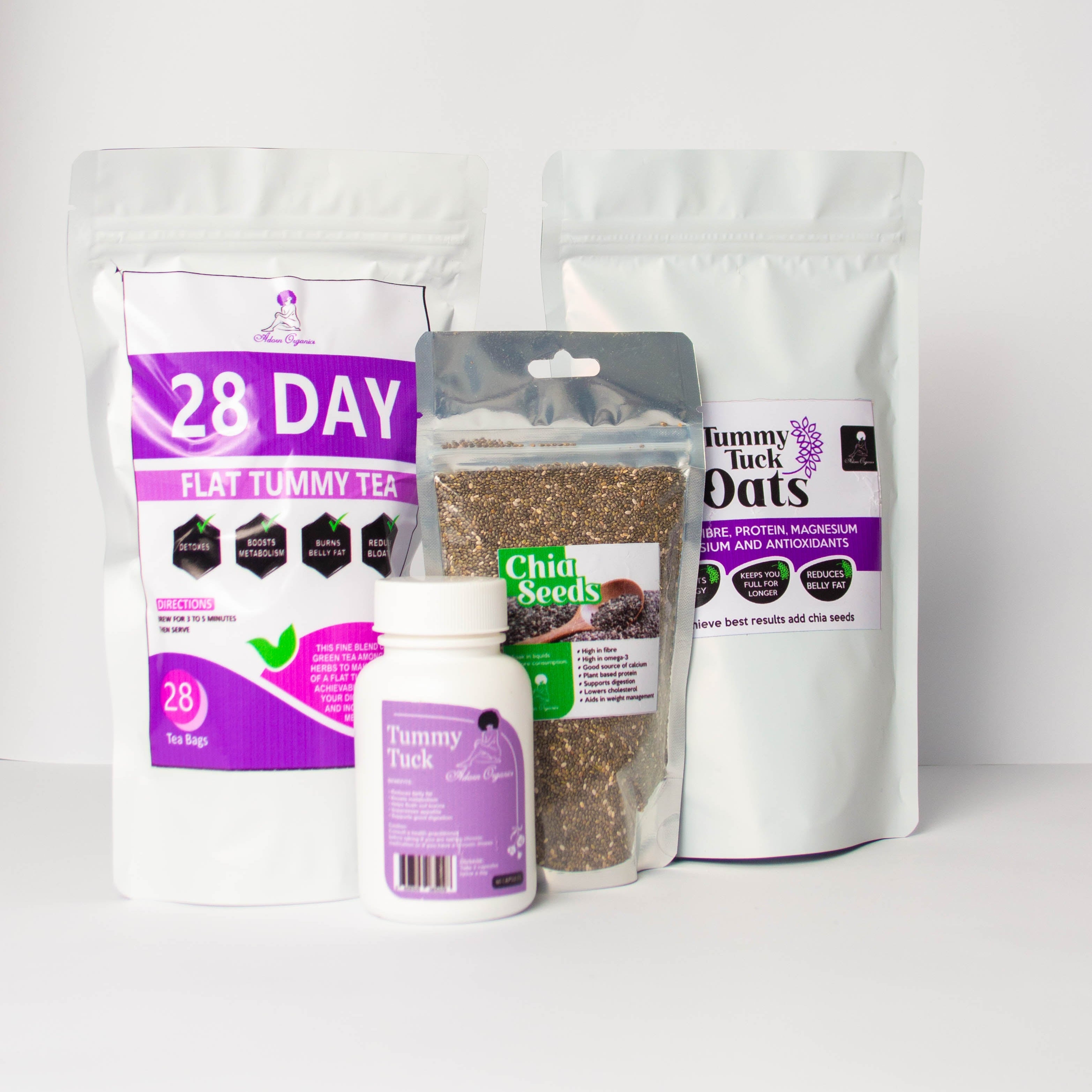 Includes: 200g Chia Seeds, 28 Day Tea, 400g Oats, 60 Capsules