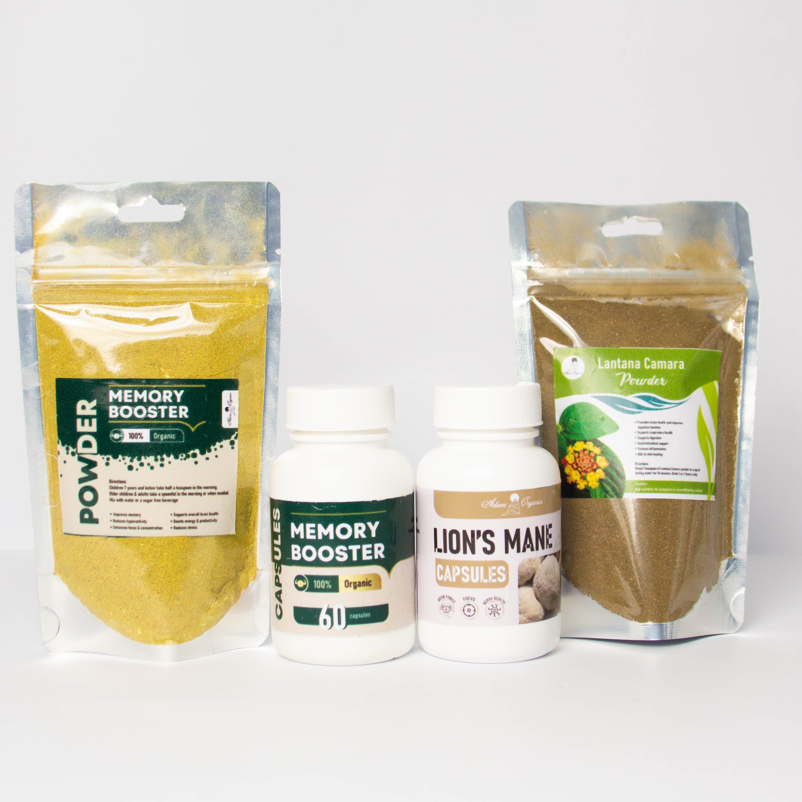 Includes: 100g Memory Booster Powder, 100g Lantana Camara, 60 Memory Booster Capsules, 60 Lion’s Mane Capsules