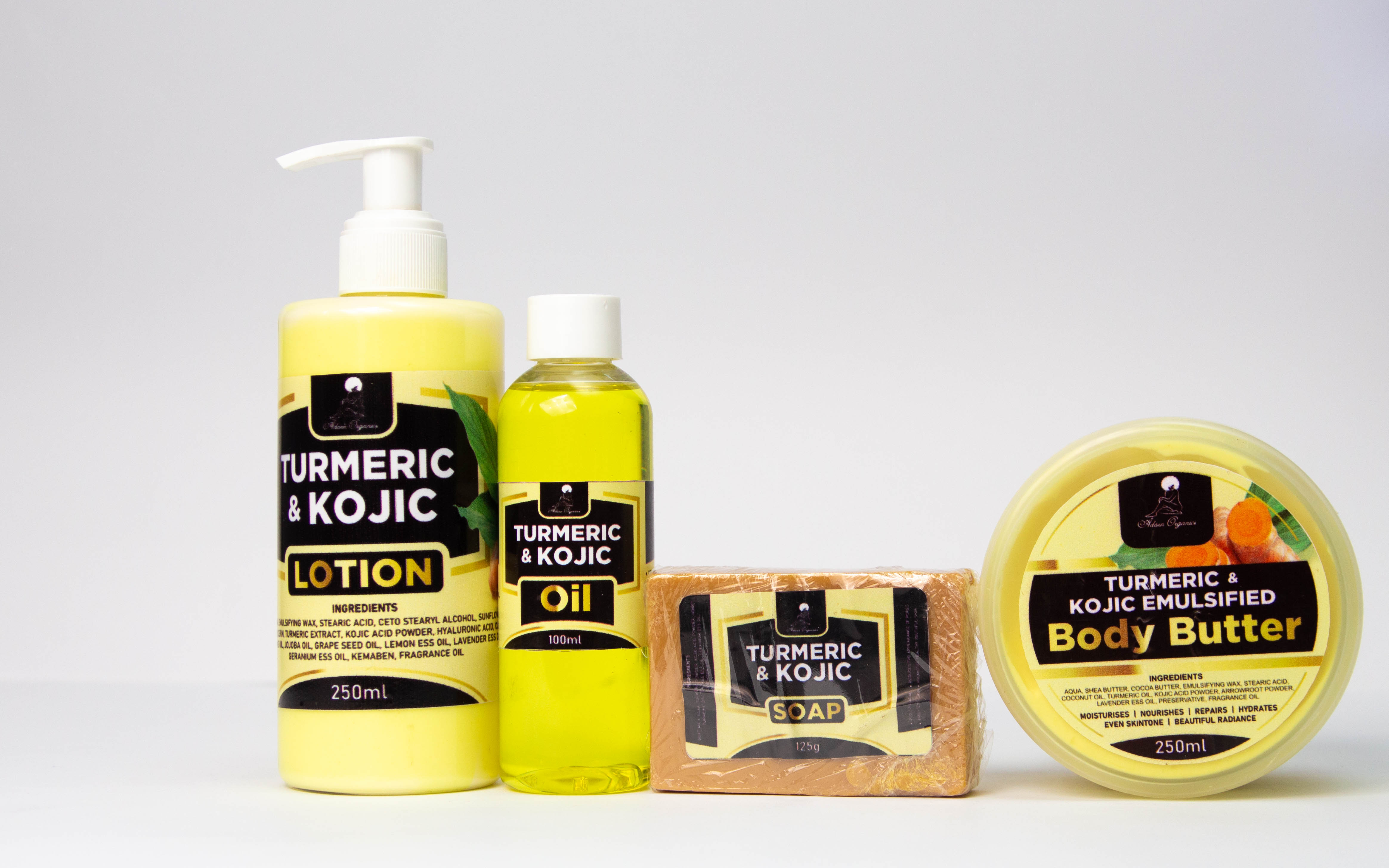Adorn Organics Turmeric & Kojic Quad set provides full‑body brightening and moisture for clear, radiant skin across South Africa.